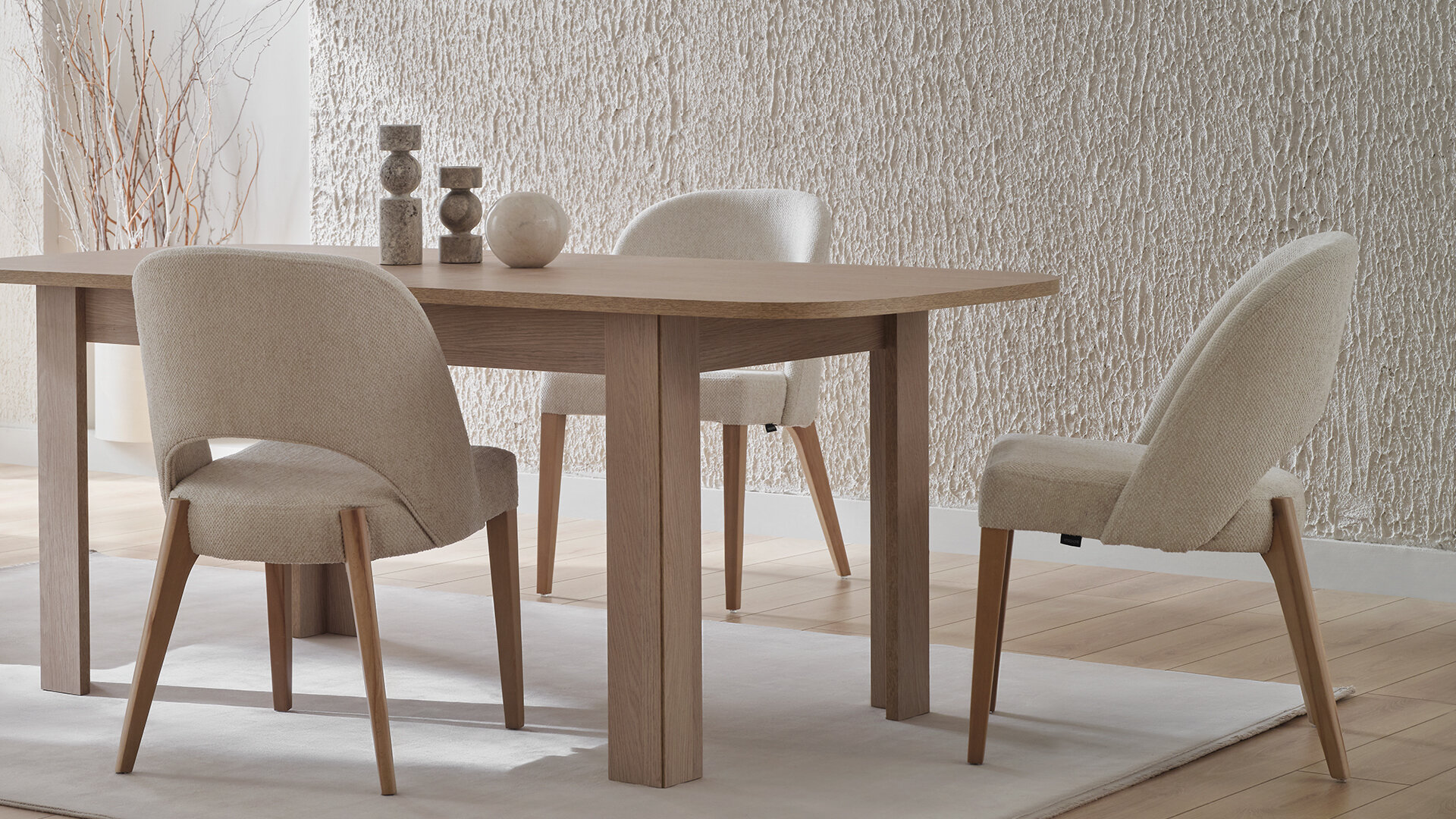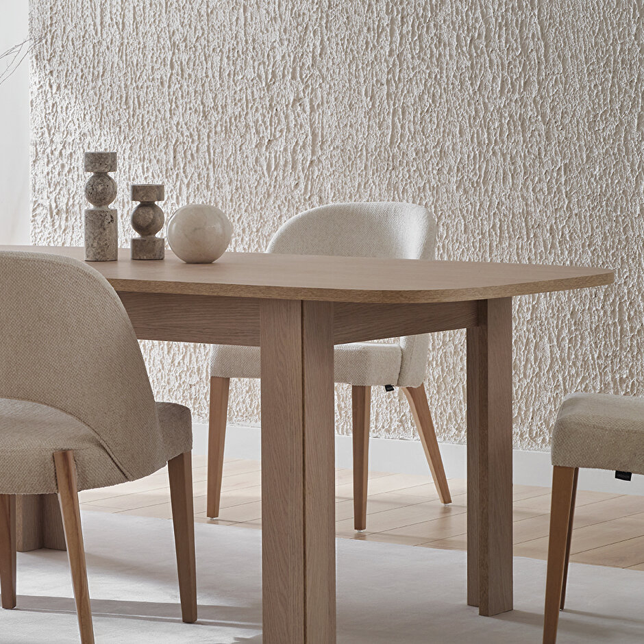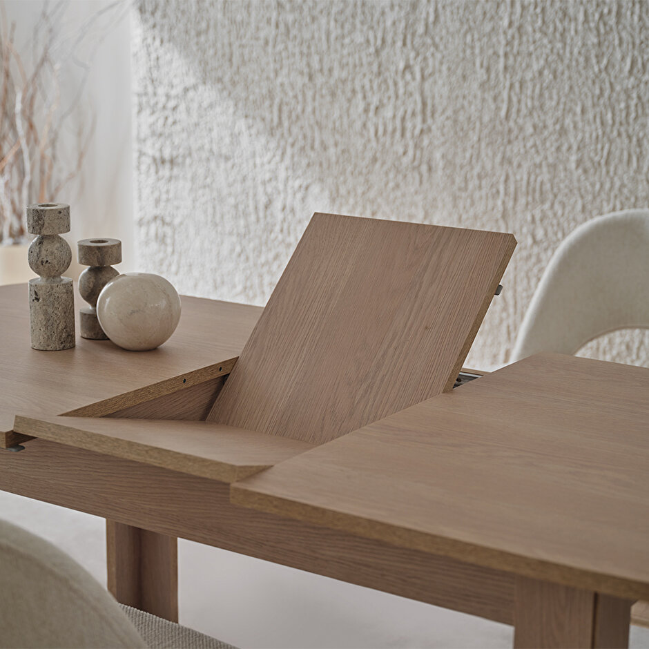 PERGE AÇILIR MASA, doğal meşe renginin sıcaklığı, tekstil dokulu krem renk ile uyum içinde birleşerek huzurlu ve samimi bir atmosfer yaratıyor. Detaylarıyla sağlam bir yapı sunarken, aynı zamanda minimal ve zarif bir tasarım yaratıyor. PERGE AÇILIR MASA, konforlu bir oturum ve fonksiyonel kullanım için ideal olup açılabilir yapısıyla geniş oturumlar için mükemmel bir seçenek sunuyor.